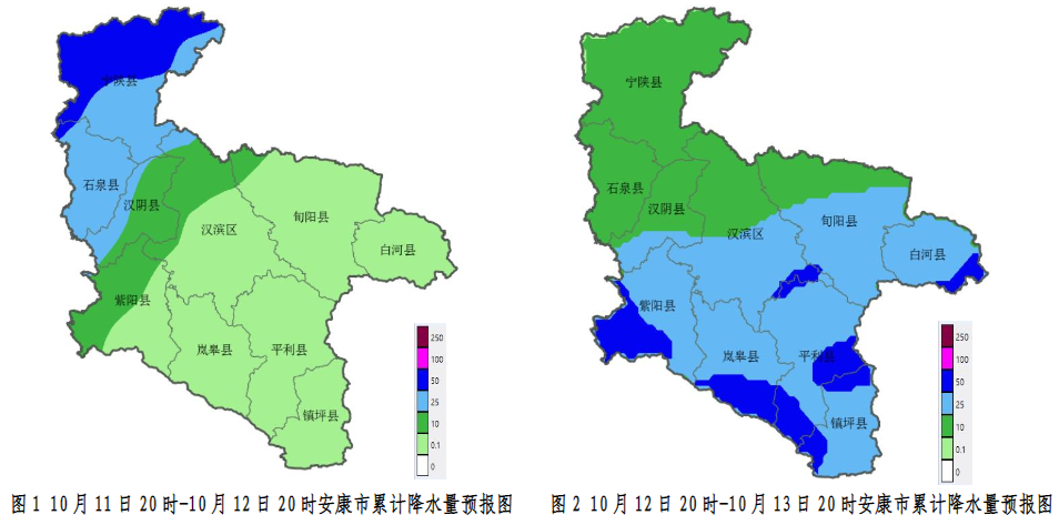 10月12日:全市大部陰天轉大雨(25~45毫米),紫陽大部、嵐皋南部、平利中南部、鎮坪、漢濱南部、白河局地有暴雨(超過50毫米),過程期間局地伴有雨強超過10毫米/小時的強降水;