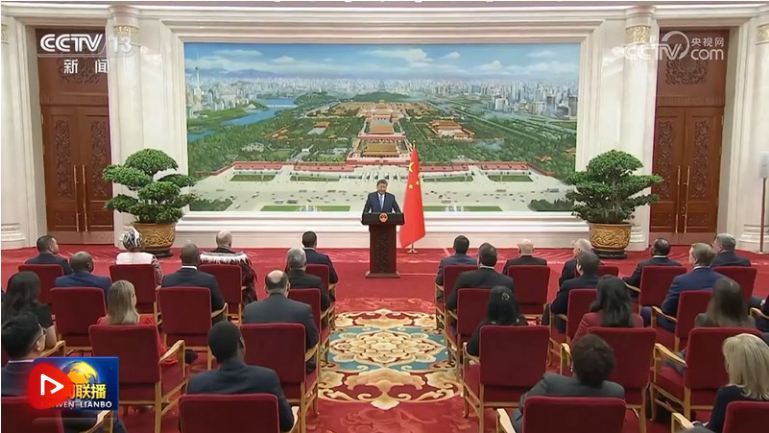 儀式結(jié)束后,習(xí)近平在北京廳對(duì)使節(jié)們發(fā)表講話。