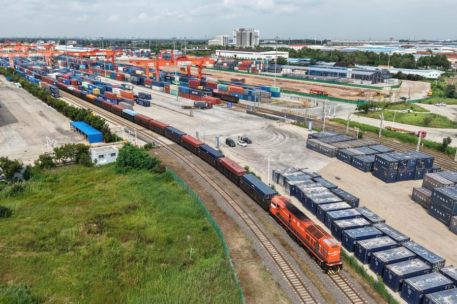 8月27日,一列貨運列車駛入位于上合示范區內的中國-上海合作組織地方經貿合作示范區多式聯運中心(無人機照片)。新華社記者李紫恒攝