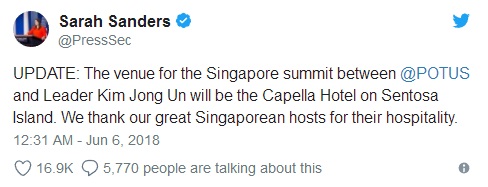 白宮發言人桑德斯美國當地時間5日在推特上表示,特朗普與金正恩將在嘉佩樂酒店舉行會晤。她還感謝新加坡為此次會晤所做的精心準備。據法新社報道,之所以選定嘉佩樂酒店作為會晤地點,是因為其所在的圣淘沙遠離人口更密集的新加坡本島,易于安保。連接圣淘沙與新加坡本島的僅有一條700多米長的堤道,此外還有纜車,很容易就能將交通完全切斷。