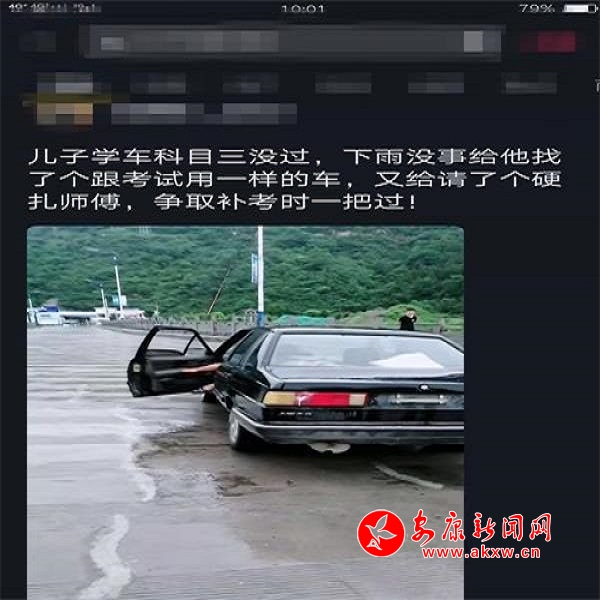 2019年7月17日,梁某某吃完中午飯后,想到其兒子去年考駕駛證科目三沒有過,今年暑假需要補考,又擔心過不了,就動了小心思,何不提前找一個和考試車差不多的給他練練手,這樣考試成功的幾率會大些,便找來一輛黑色桑塔納交由兒子練習,并發了一段抖音視頻:“兒子科目三沒過,下雨沒事給他找了個跟考試用一樣的車,又給請了個硬扎師傅,爭取考試時一把過”,旬陽縣公安局交警大隊甘溪中隊民警根據視頻找到其練車地點,對梁某某父子的違法行為進行了現場批評教育,并將其傳喚到中隊接受調查,目前案件正在辦理中。