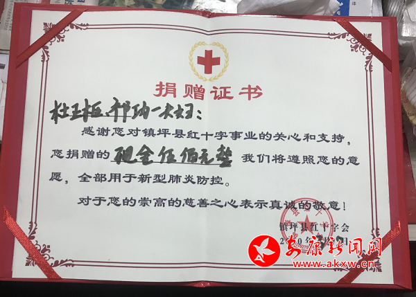 本網(wǎng)訊(通訊員 韋慰)今年以來,新型冠狀病毒感染的肺炎疫情牽動著每一個人的心,3月18日,家住鎮(zhèn)坪縣城關(guān)鎮(zhèn)上新街竹溪河社區(qū)的88歲退休老干部杜正樞慎重地將500元現(xiàn)金交給鎮(zhèn)坪縣紅十字會工作人員,并囑咐其要把錢用于支持疫情防控,為疫情防控獻(xiàn)一份力。